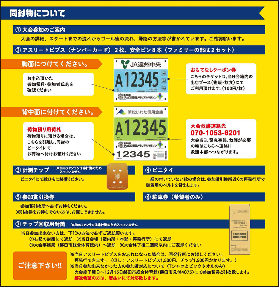 大会にエントリーされた参加者の皆さまには11月7日ころに以下のものを発送いたします。地域や事情により到着まで10日前後かかることがありますのでご了承ください。